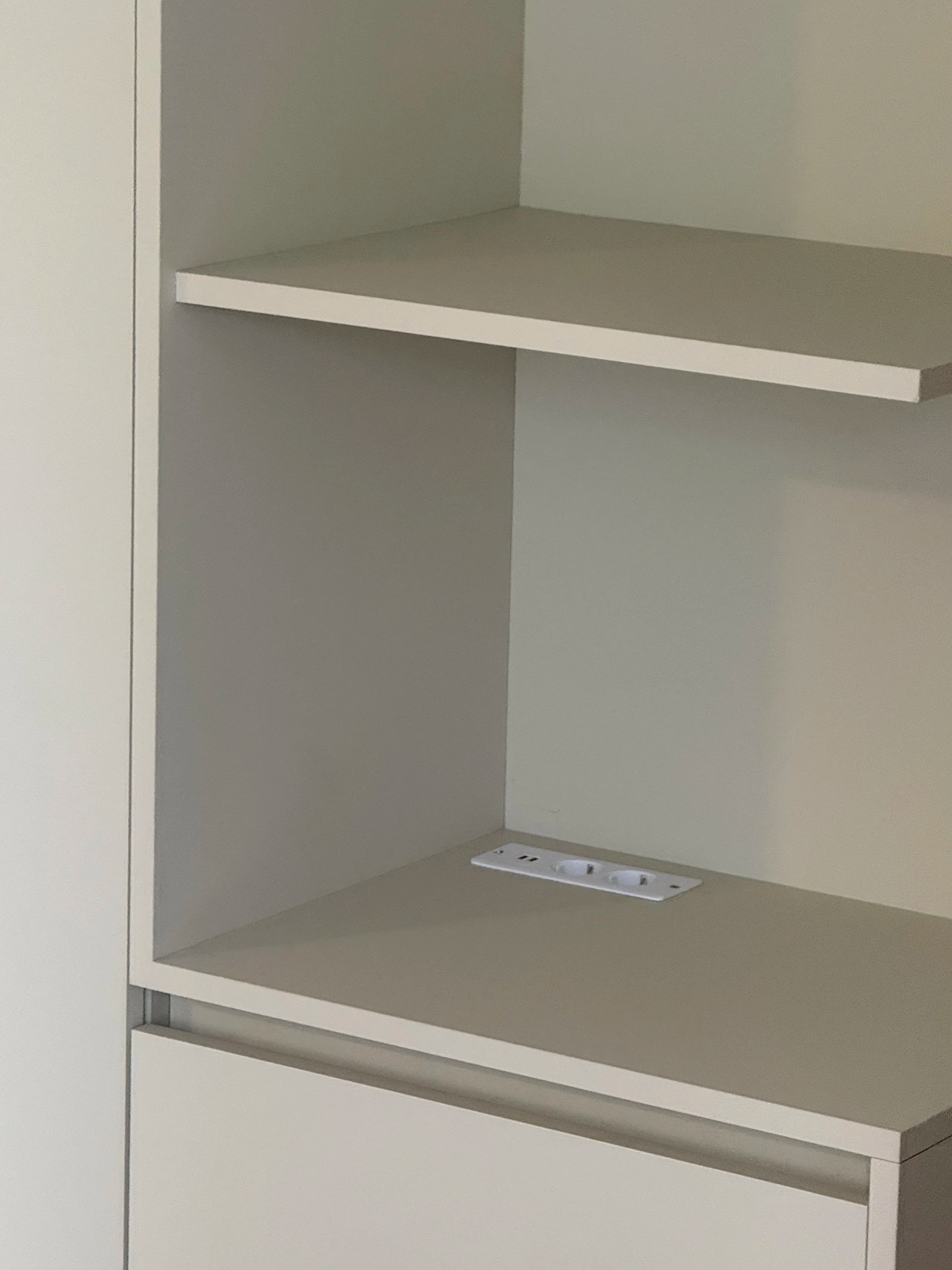 Daarnaast zijn op drie strategische plekken in de kast subtiel ingebouwde stopcontacten verwerkt.